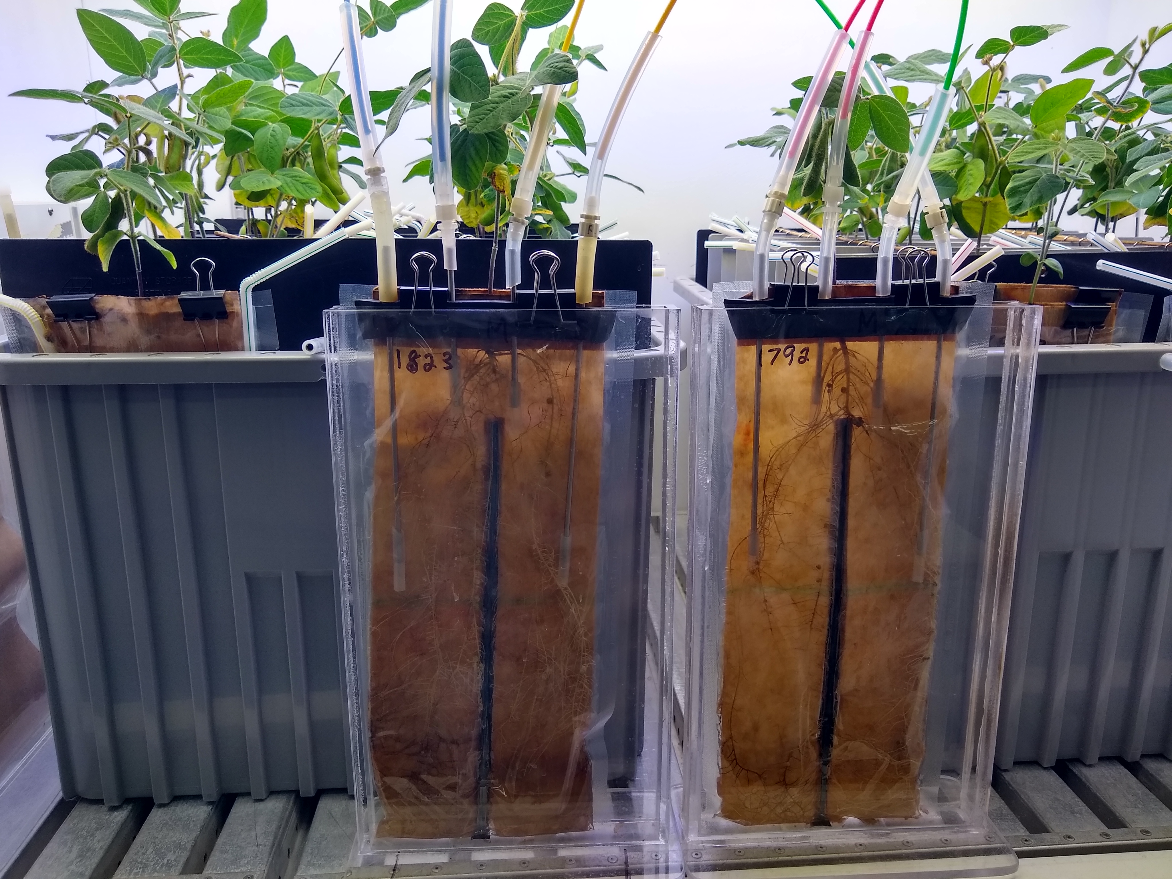 The PI actually measures the production of hydrogen gas, a byproduct of nitrogen fixation. Some nitrogen-fixing rhizobia recycle hydrogen, so this approach won’t work with them. In the photo, two PIs (actually, an earlier prototype) are being used to measure hydrogen production on two sides of two split-root plants, so compare N fixation by different strains of rhizobia.